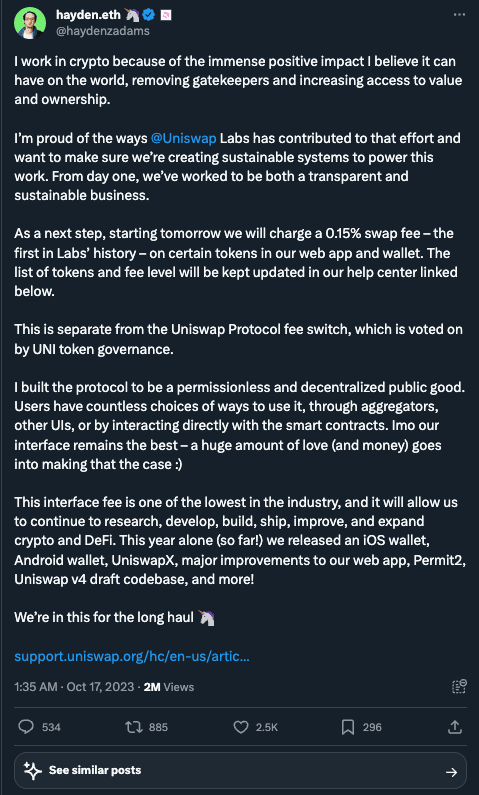 The recent Interface Fee introduced by Uniswap has ignited a heated debate within the DeFi community, further illuminating the complexities of the relationship between tokenholders, equityholders, and project governance. This fee, amounting to 0.15% (or 15 basis points), applies to specific transactions conducted through Uniswap's front-end interface. However, what sets this fee apart from traditional transaction fees is that it does not flow to the benefit of tokenholders. Instead, it accrues to Uniswap Labs, the central operating entity behind the Uniswap protocol.