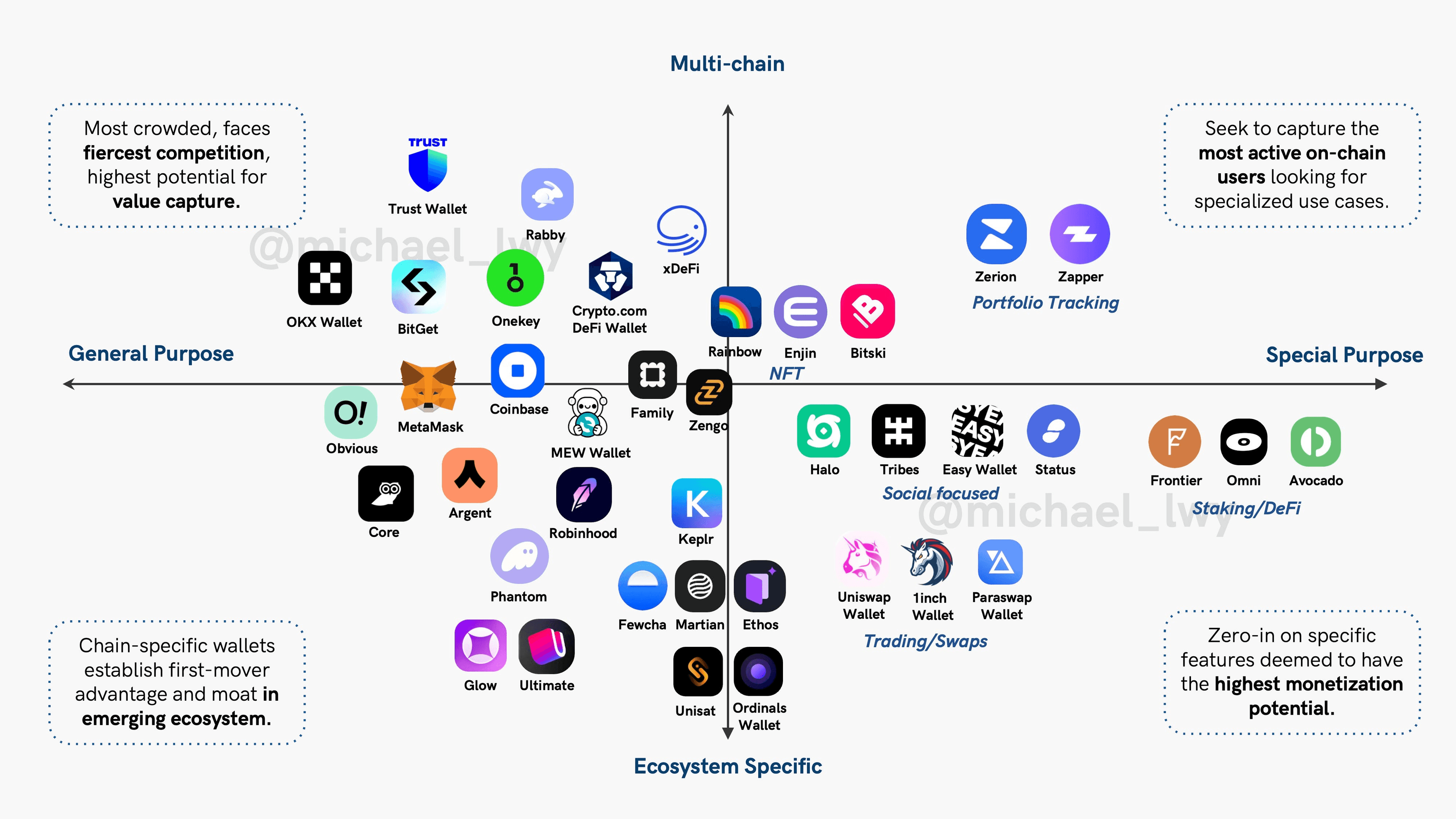 Ecosystem inclination: Found in the bottom left quadrant are wallets with a discernible bias towards specific blockchain ecosystems, aiming to secure early footholds in rising chains. Phantom (Solana) and Core Wallet (Avalanche) exemplify this strategy.