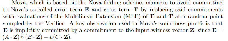 Mova's primary innovation is its ability to bypass the need for commitments to error terms (E) and cross terms ( T ). Instead of committing to these terms directly, Mova uses evaluations of their Multilinear Extension (MLE) at random points chosen by the verifier.