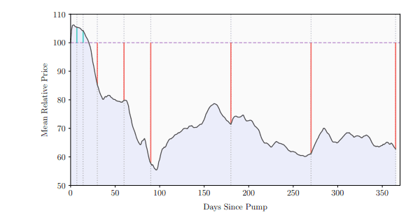 Over a longer time horizon, our findings indicate that pump events have a detrimental effect on the targeted cryptocurrencies. The price charts of these coins often display a pattern of sharp spikes followed by prolonged declines. This suggests that pump events not only fail to sustain price growth but also contribute to market instability and erode investor confidence.