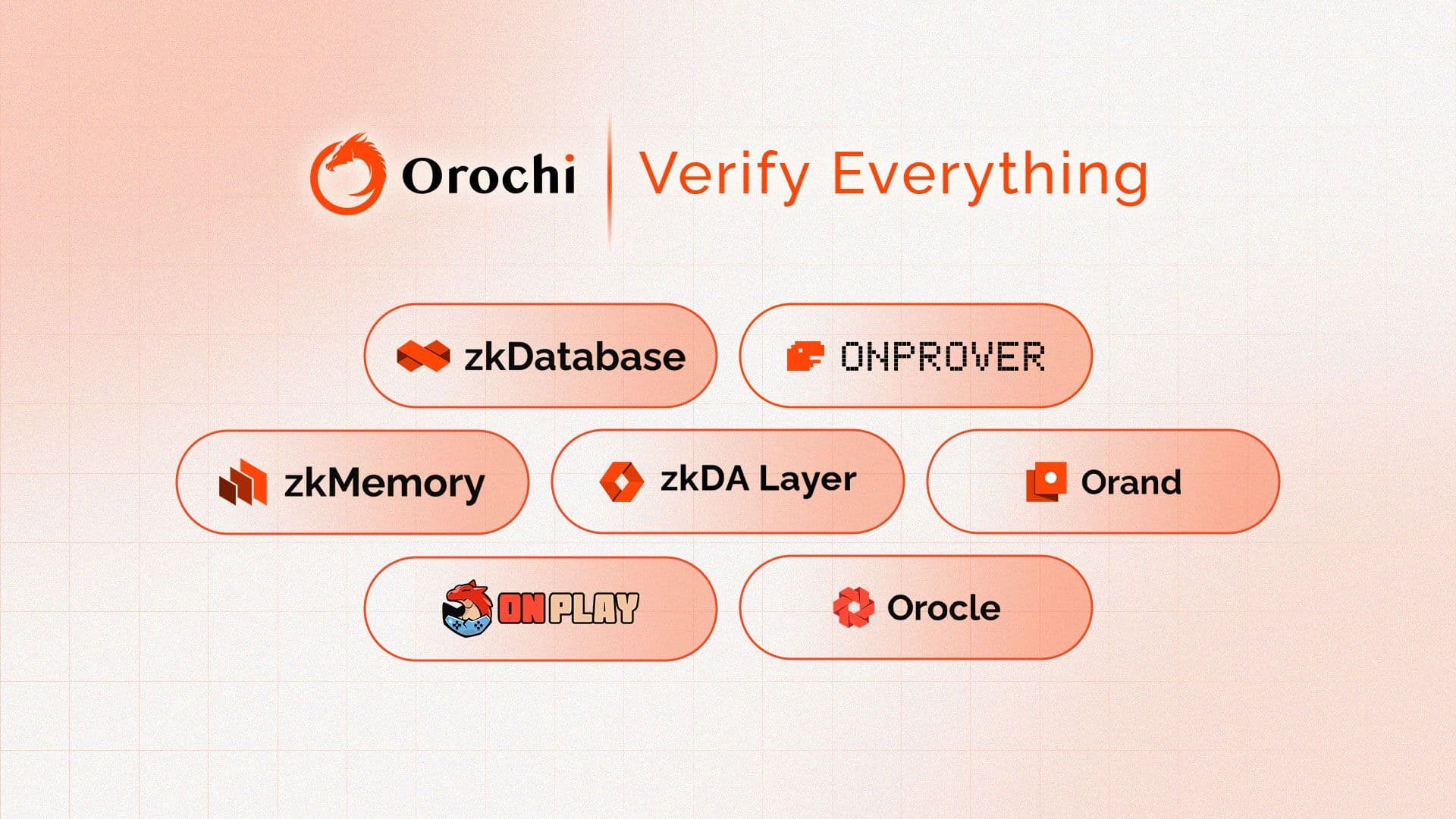 The Orochi Ecosystem is a modular, verifiable data infrastructure built on zero-knowledge proofs (ZKPs). It includes zkDatabase, zkDA Layer, ONProver, Orand, Orocle, ONPlay, and ONTegrity, each serving a critical role in securing and verifying data across Web3, AI, DeFi, and RWA applications.